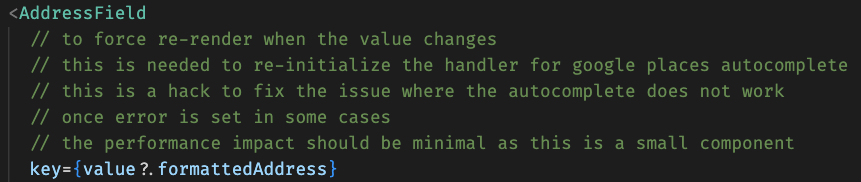 While debugging multiple times, I noticed that even if the autocomplete suggestions were not showing up, when the component was unmounted/remounted, the suggestions would start showing up again. So, that's what I did: a hacky solution to unmount/remount the component whenever the user selection changed. This meant that whenever the user selected an address or even cleared the address, the component would unmount and remount, and the suggestions would start showing up again. And all it took was a simple key prop to the parent component.